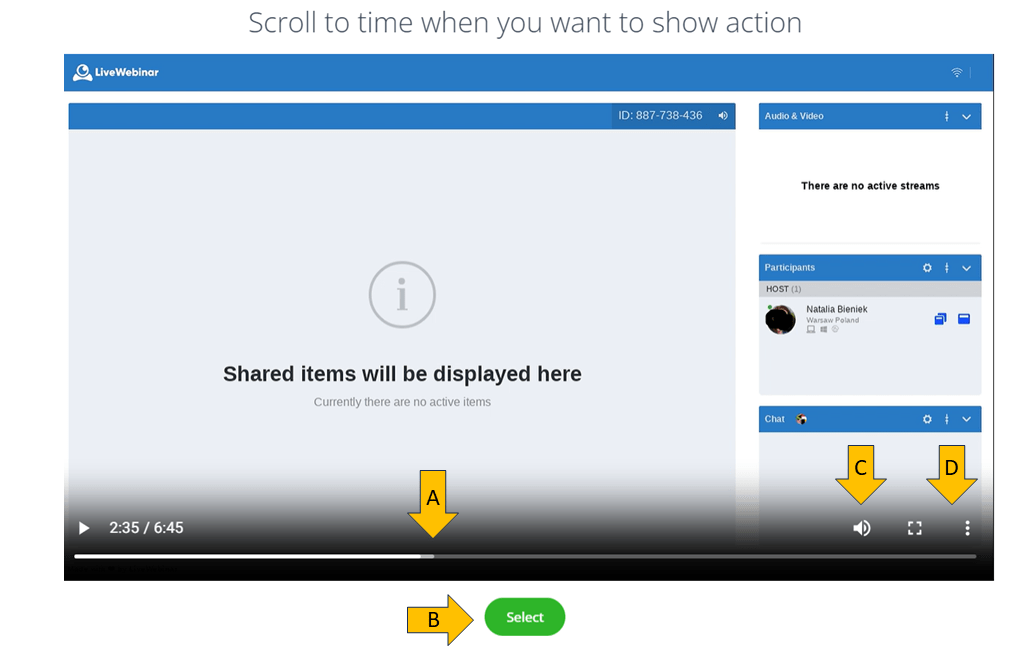 A, B – Select if your webinar should be one-time event or a repetitive one. You can decide whether you want your webinar to take place on a specific date or if you want to run it i.e every Monday for three weeks in a row (choose frequency from point E)