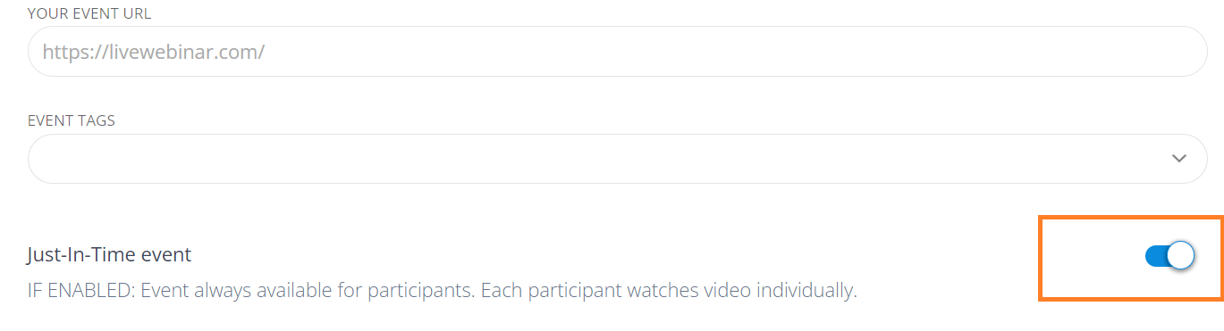 Toggle the Just-In-Time option if you want attendees to join your event anytime. The recording you’ve chosen in the previous steps will be displayed individually for each of them.