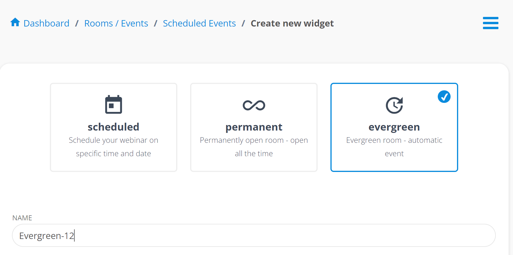 4. Name your webinar (example: “Evergreen-12”) and select “Evergreen room – automatic event”.