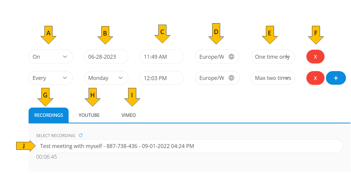G – If you click on this button, you will be able to select a recording for your Evergreen webinar, and the list of your LiveWebinar recordings will appear down below.