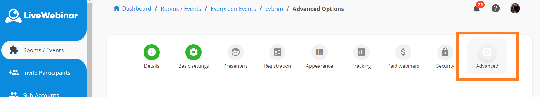 You can also set up Countdown clock for your Evergreen webinar. To do so, go to Advanced options in the upper menu of the Evergreen event you want to organize.