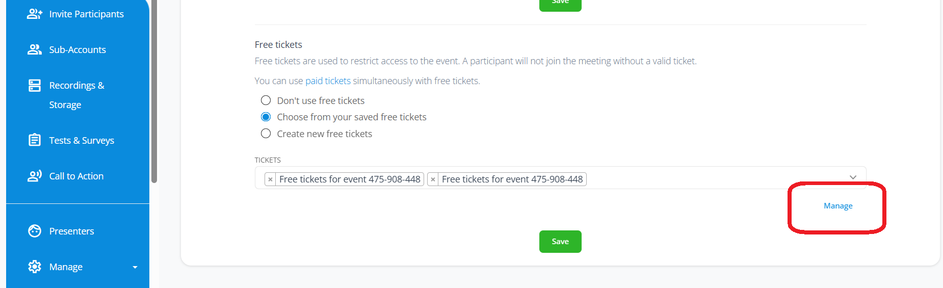 In order to manage tickets, make sure to click the “Manage” link highlighted in blue.