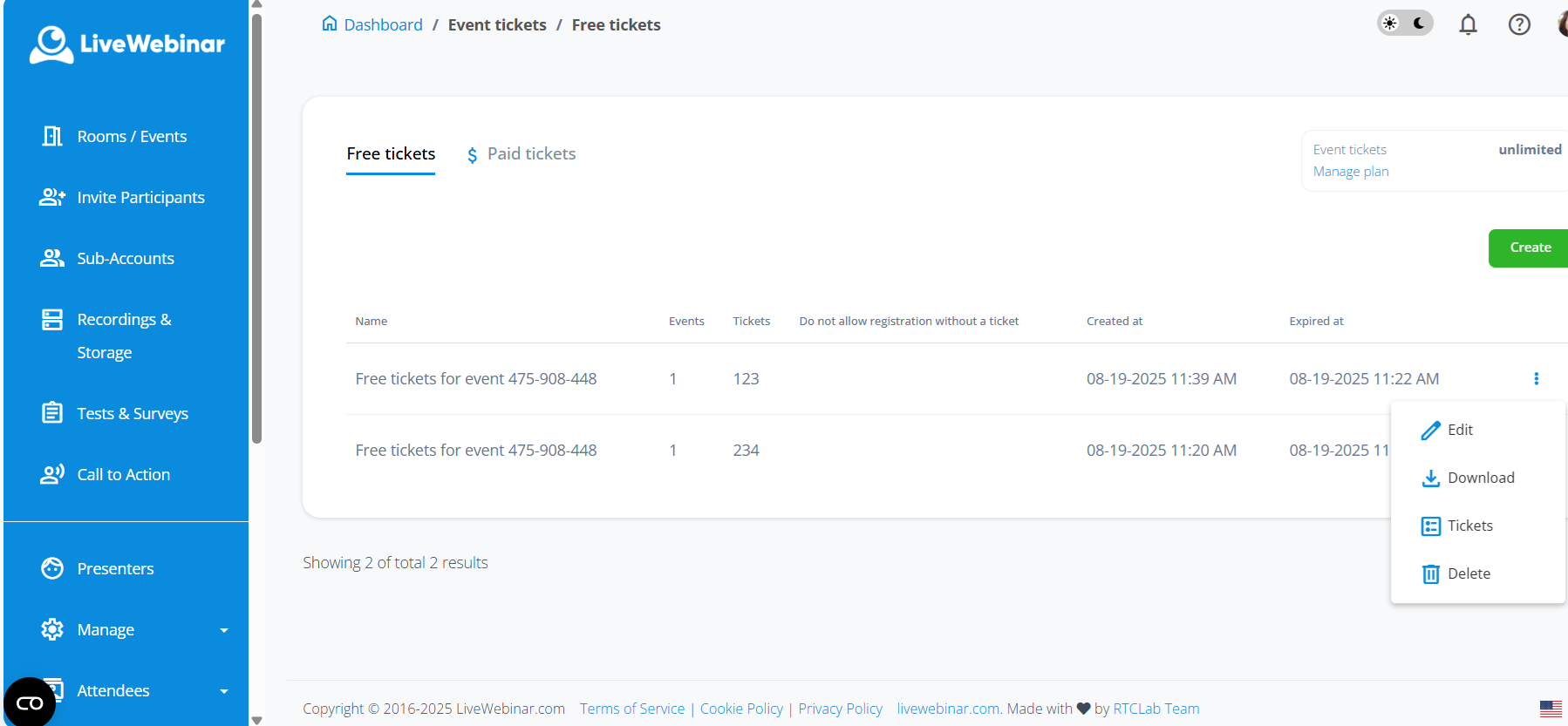 3.3. Tickets - Look up your tickets, check their creation date, expire or delete them