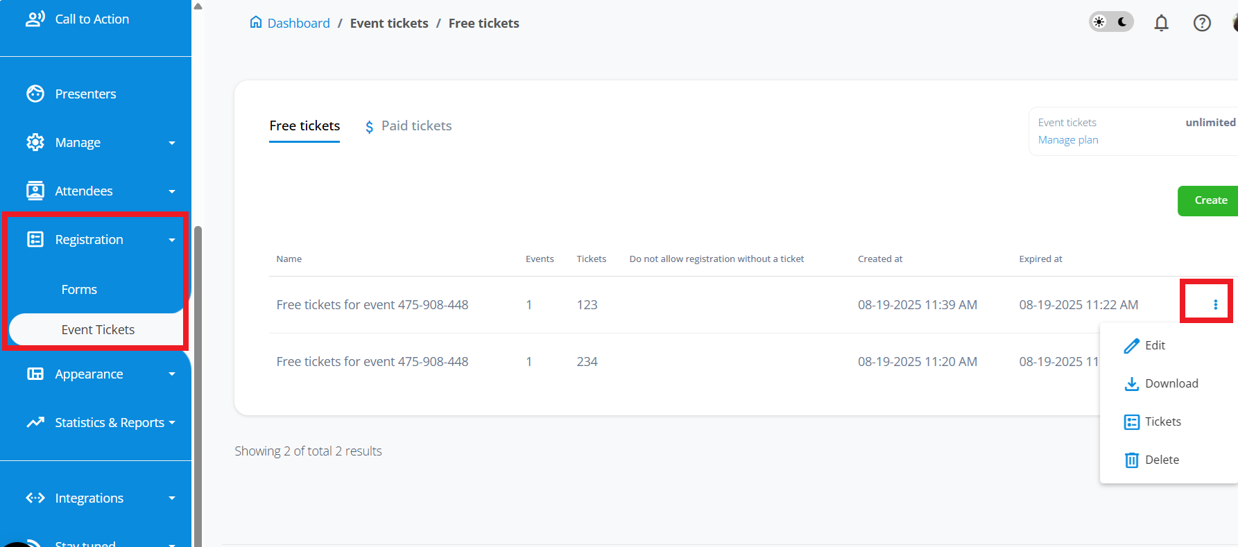 This will redirect you to the “Event tickets” submenu in the “Registration” tab.