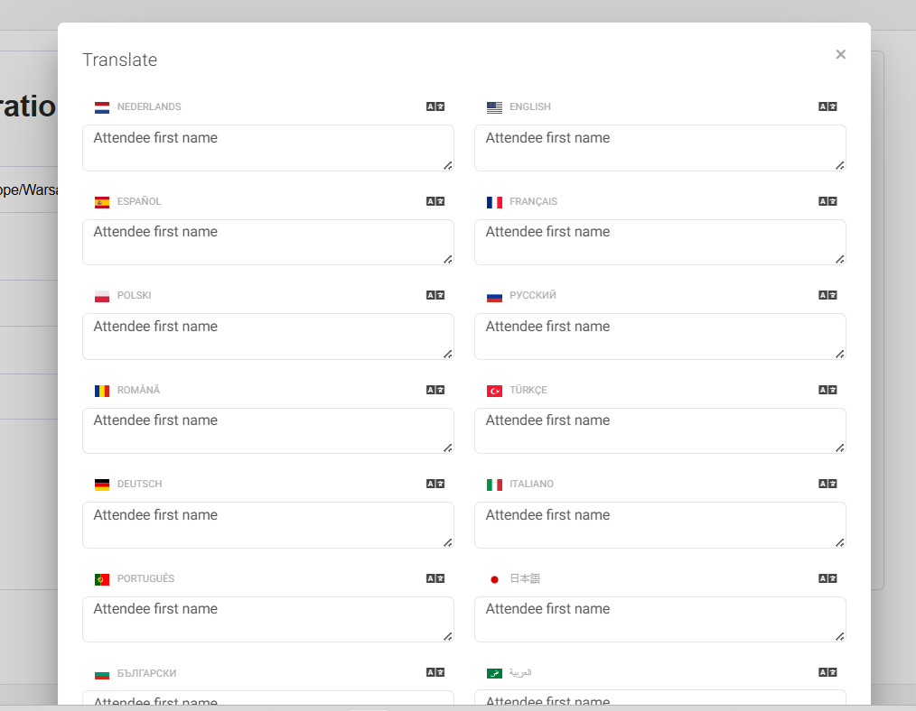 Click the “Translations” button. A window (modal) will open with a list of all languages supported by the system.