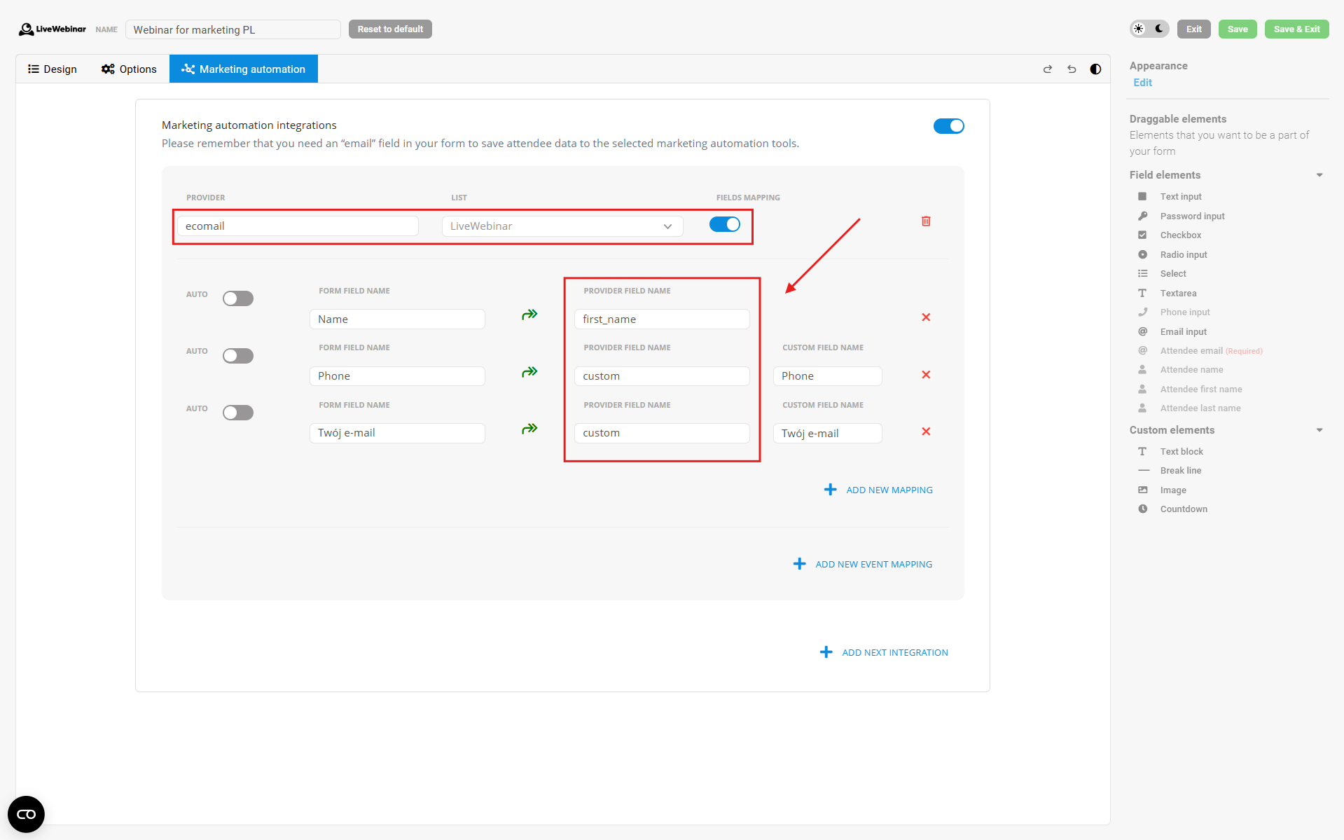 3. Confirm: Save the settings and proceed to create or edit your webinar.4. Configure the form: While setting up the registration form, go to the Integrations tab. Select Ecomail from the provider list, choose your target contact list, and map the form fields correctly.