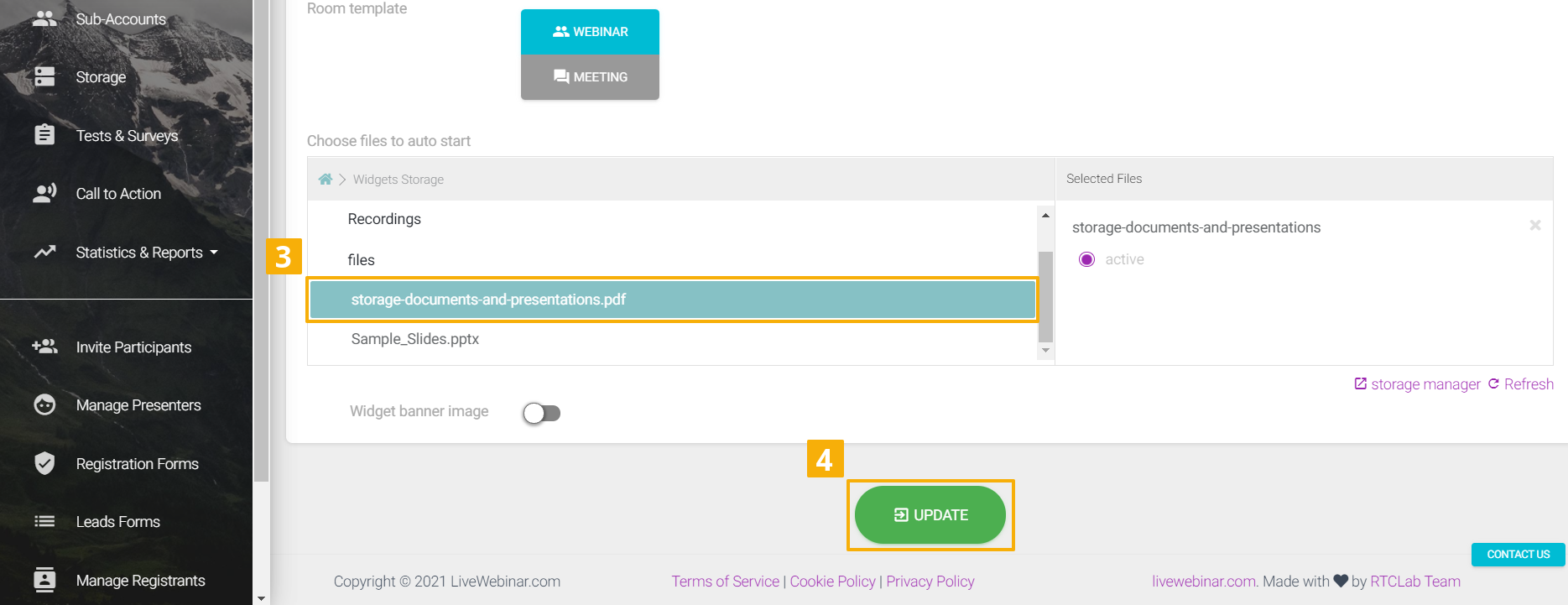 You can prepare the presentations, videos, or YouTube videos you want to be opened in the room (as tabs) when you first enter the room. Then when you join your webinar – these documents will be already opened for you, so there is no need to browse through the storage and open them up.