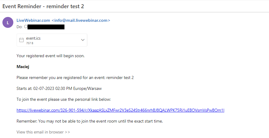 Reminders typically include the following information: the date of the event, the exact time when it starts and the personal link to the webinar room for the registrant to join the session. Below is an example of an event reminder: