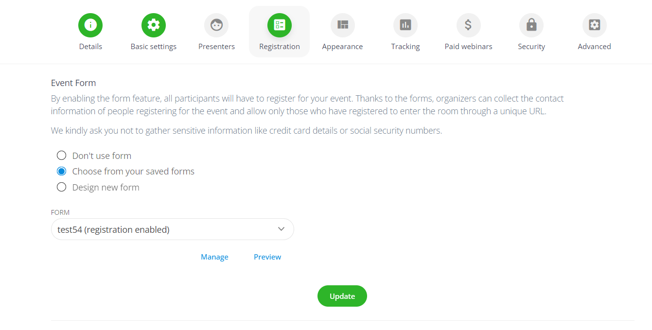To use reminders, you need to go to the “Registration” tab while planning your event. First you have to choose a form from your saved forms or design a new form.