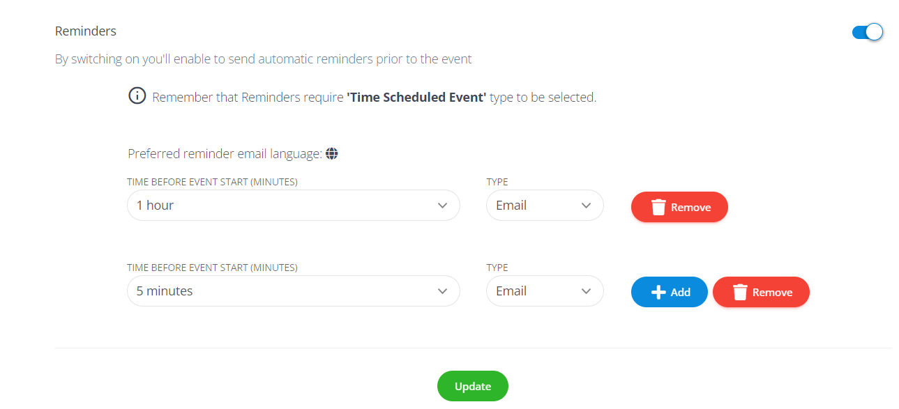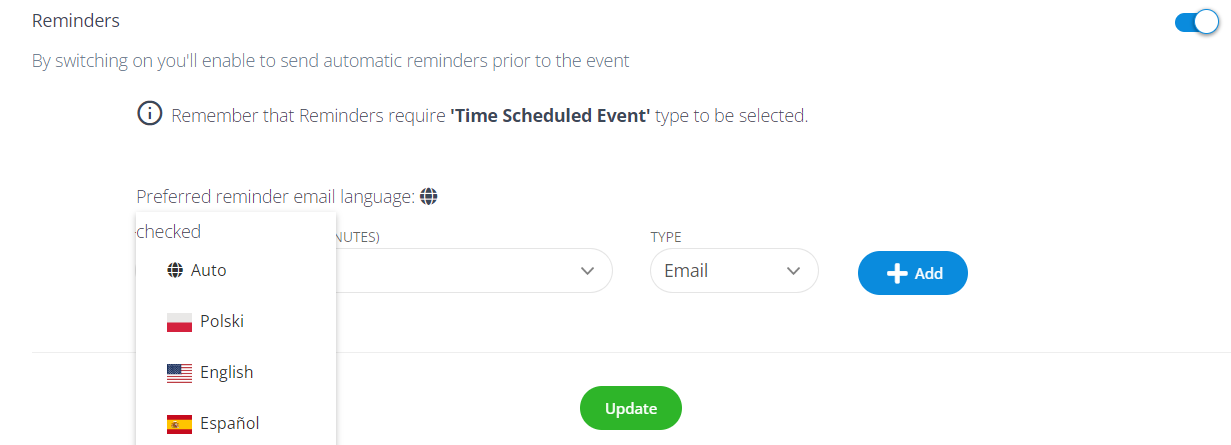 Automatic reminders can be sent in one of the available languages of the platform. If participants of the event come from all over the world, use the “Auto” option to automatically set the language to the participant’s language.