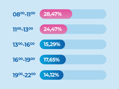 Jeśli chodzi o godziny — najlepiej sprawdzają się godziny w środku dnia: 11:00 a 13:00. Jednocześnie 25% uczestników preferuje godziny wieczorne (19:00–22:00).