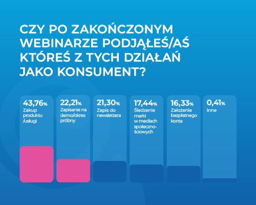 To jeden z najważniejszych wniosków raportu: prawie 70% uczestników przyznaje, że webinary wpływają na ich decyzje zakupowe. W liczbach oznacza to: 43,76% dokonuje zakupu, a 22,21% rejestruje się na demo lub okres próbny.