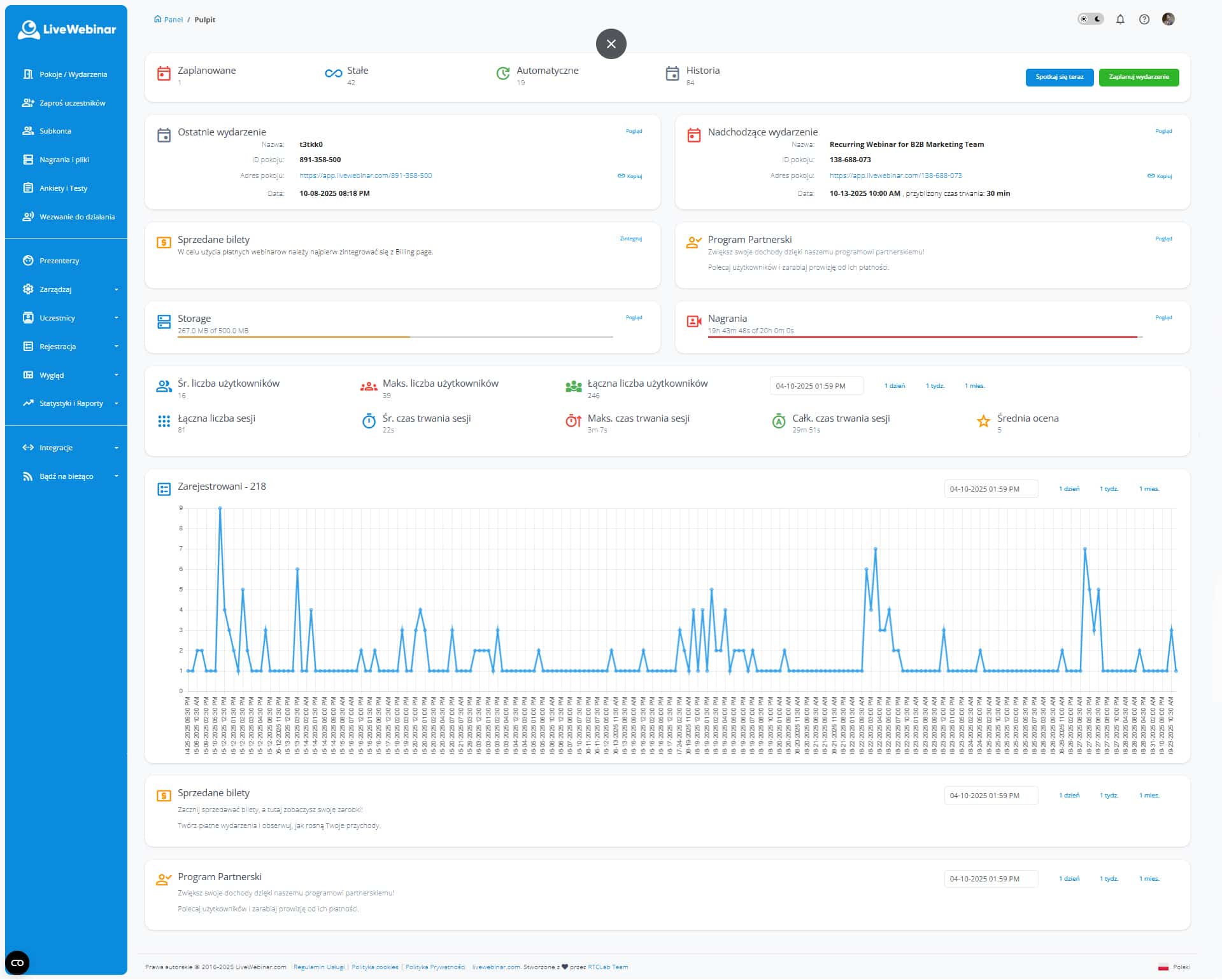 W panelu zebraliśmy tam kluczowe dane, które pomogą Ci łatwiej zarządzać webinarami i spotkaniami. Dzięki nim: