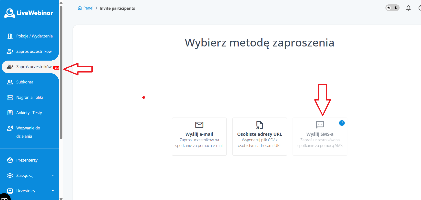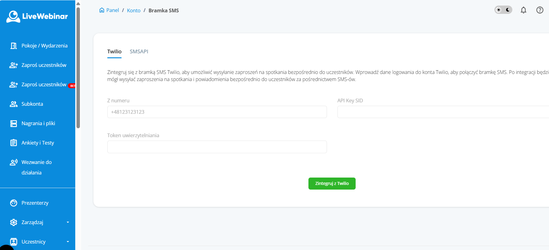 Aby to zrobić, wejdź w zakładkę w bocznym panelu "Zaproś uczestników" i zintegruj konto z bramką SMS, przez uzupełnienie wymaganych danych.