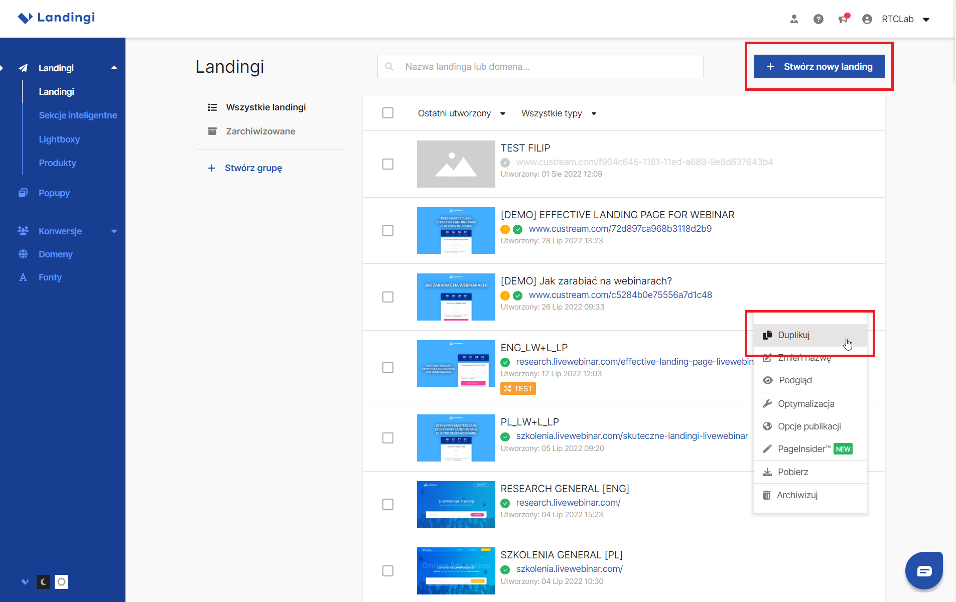 2. Kiedy twoje wydarzenie będzie gotowe, możesz przystąpić do budowania swojego landing page za pomocą kreatora na platformie landingi.com. Aby to zrobić zaloguj się w serwisie landingi.com i z poziomu panelu użytkownika wybierz opcję STWÓRZ NOWY LANDING. Jeżeli masz już istniejące landing page w tym serwisie możesz także skorzystać z funkcji zduplikowania.