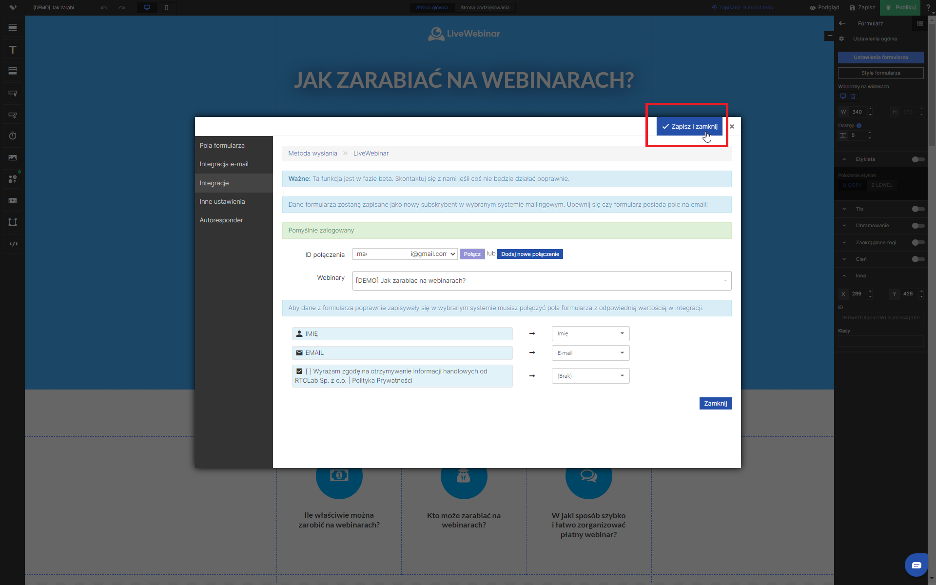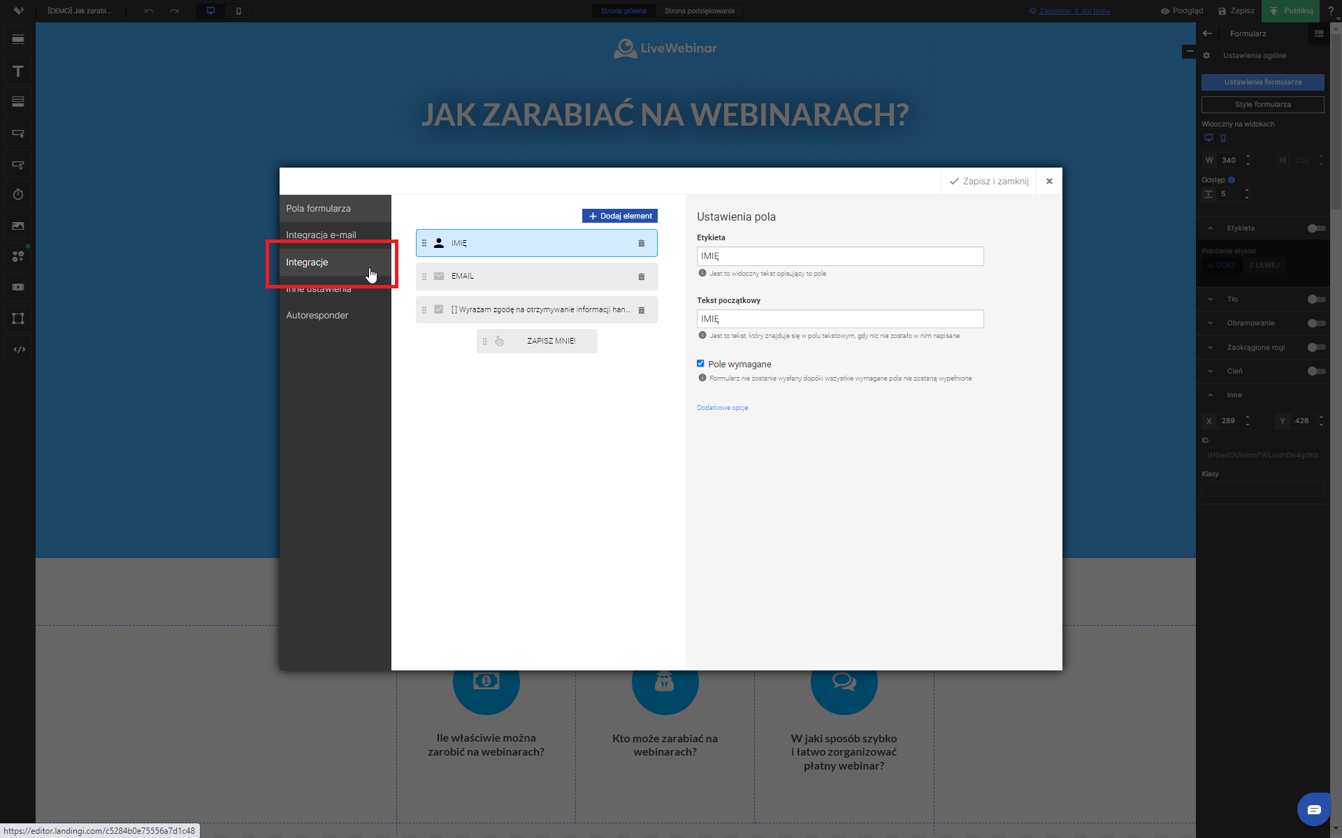 7. Pamiętaj, aby odpowiednio dopasować pola z formularza dostępnego w kreatorze Landingi oraz tego przypisanego do wydarzenie na platformie LiveWebinar.