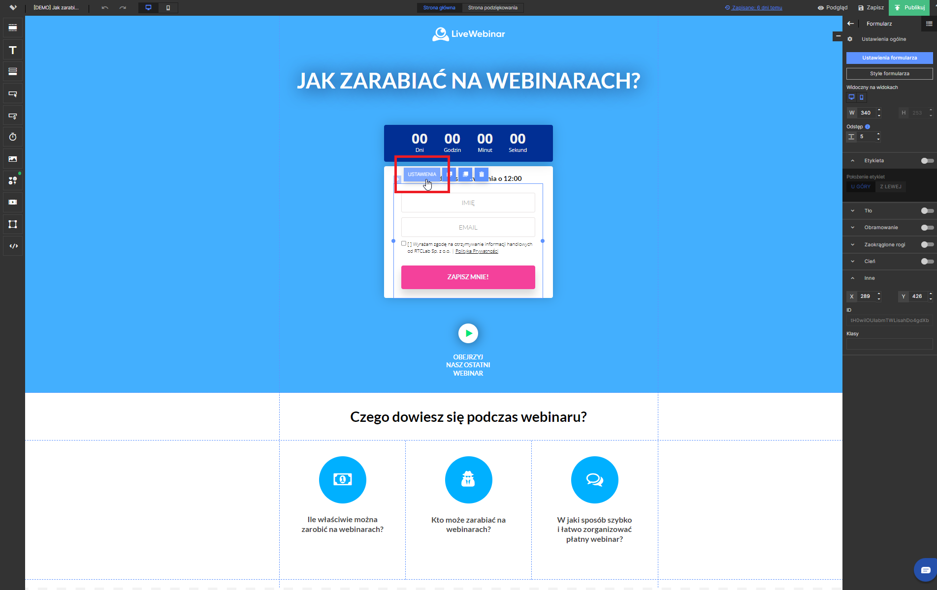 3. Po dodaniu do swojego projektu landinga formularza zapisu, kliknij i otwórz jego ustawienia.