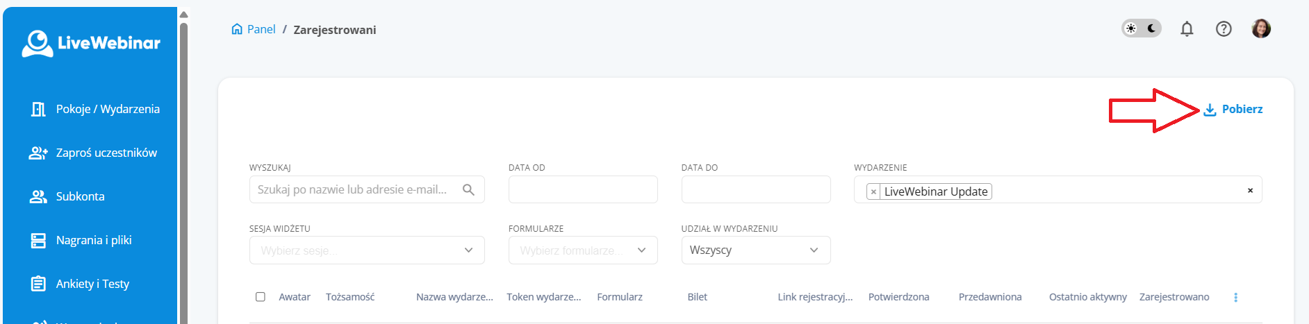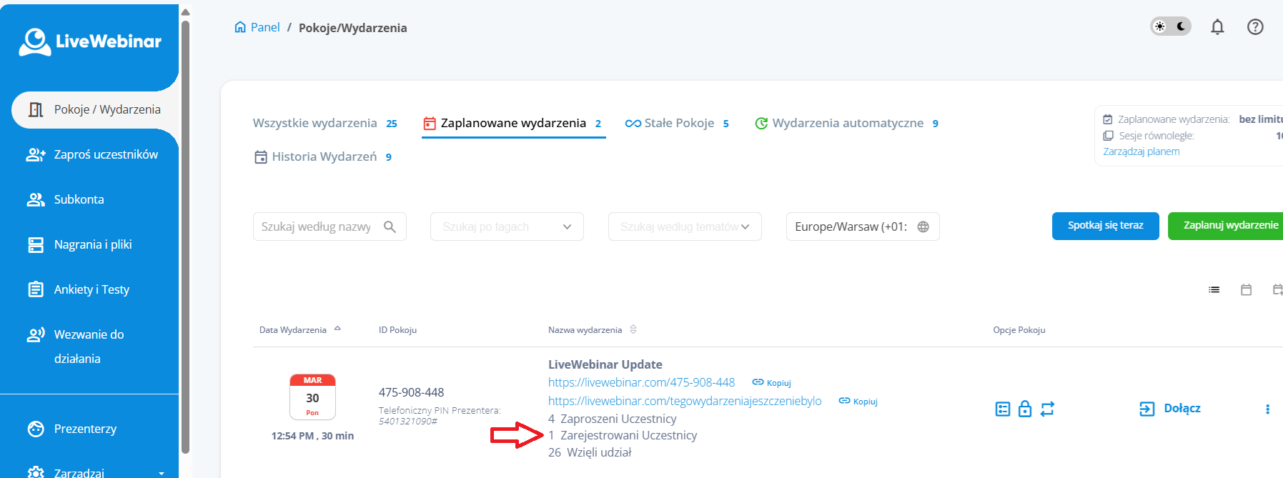 - Kliknij „Zarejestrowani uczestnicy” – odpowiednie filtrowanie zostanie zastosowane automatycznie.